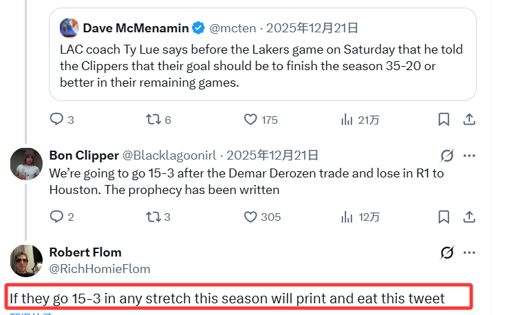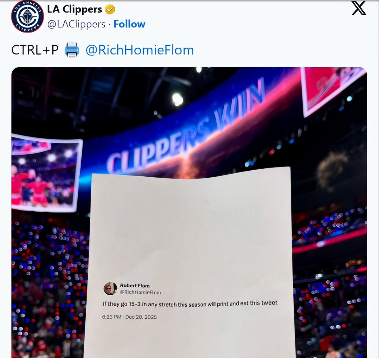 这件事的起因还要追溯到一个多月前,快船主帅泰伦-卢曾在12月21日表示,他向球队提出了剩余赛程拿下35胜20负的目标。彼时,快船的战绩仅为6胜21负。弗洛姆当时在社媒上回应卢的这一目标时写道:“如果快船本赛季能打出一波15胜3负的战绩,我就把这条推文打印出来吃掉。”